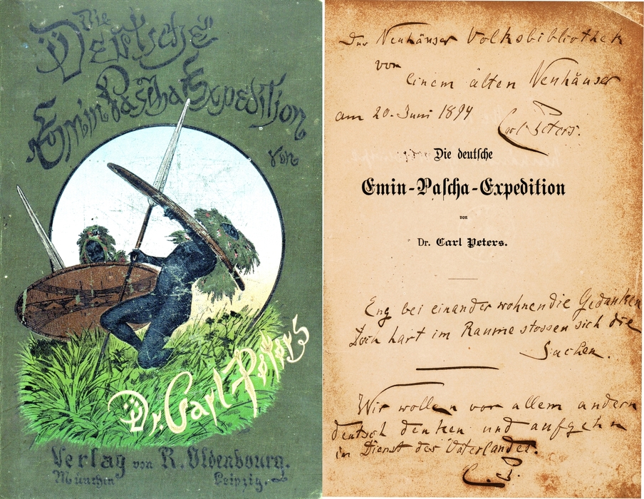 Vom gleichen Besuch stammt wohl auch Peters' Widmung in einem Exemplar seines Buches „Die deutſche Emin-Paſcha-Expedition“: „Der Neuhäuser Volksbibliothek von einem alten Neuhäuser am 20. Juni 1894 / Carl Peters. Eng bei einander wohnen die Gedanken Doch hart im Raume stossen sich die Sachen. Wir wollen vor allem andern deutsch denken und aufgehn im Dienst des Vaterlandes.“ Diese - unreine - Mischung aus Carl Peters und Friedrich Schiller kann man nachlesen im Heimatmuseum Neuhaus (Pforthaus).